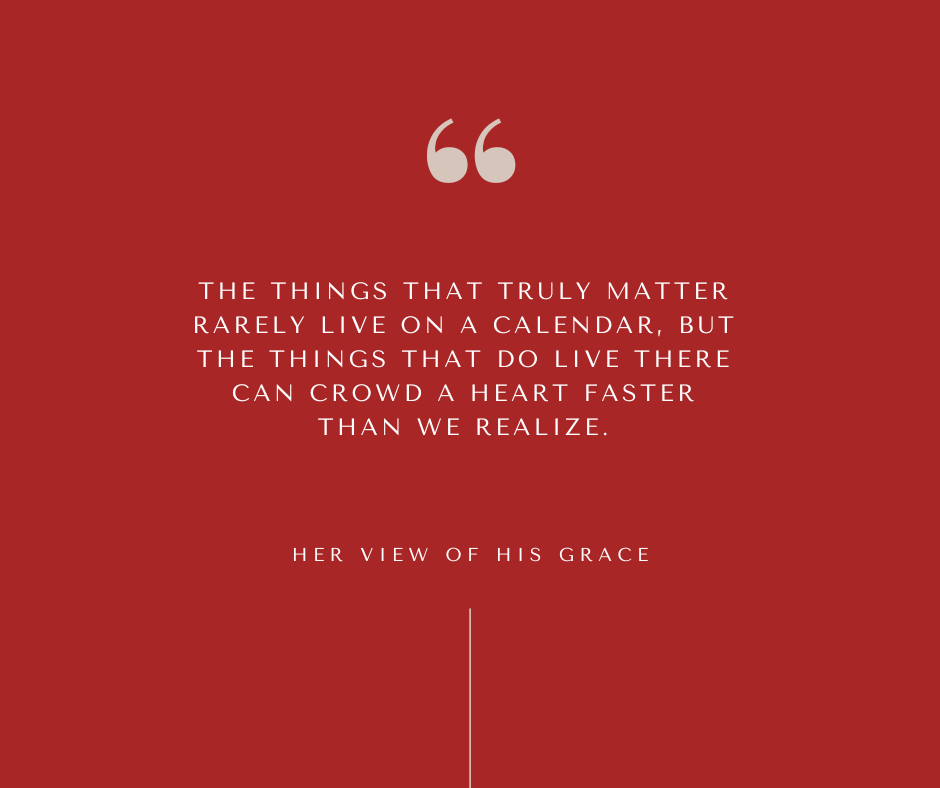 It was so simple and so freeing that I almost cried. Because He’s right. I’ve been holding tight to things that don’t have eternal weight, trying to make them feel urgent and essential when they aren’t. That grip has been crowding my soul. Somewhere along the way, I started treating the calendar like it carried the most sacred parts of my life, when most of what’s on it won’t matter in a year, much less in eternity. The things that truly matter rarely live on a calendar, but the things that do live there can crowd a heart faster than we realize.