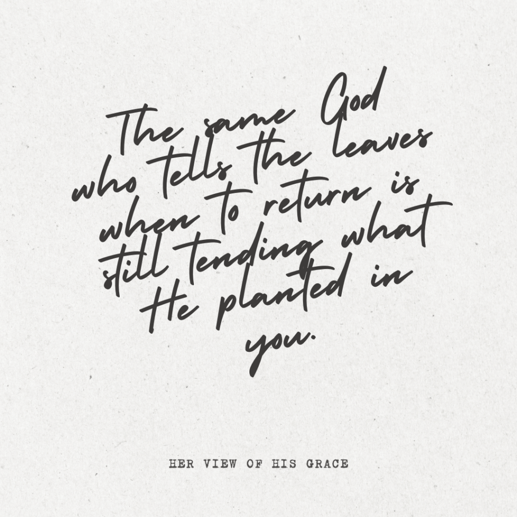 If you are walking through a season that feels barren, or quiet, or longer than you wanted it to be, do not assume God has left you there. Do not assume bare branches mean nothing is happening. Do not assume the silence means the story is over. The same God who tells the leaves when to return is still tending what He planted in you.